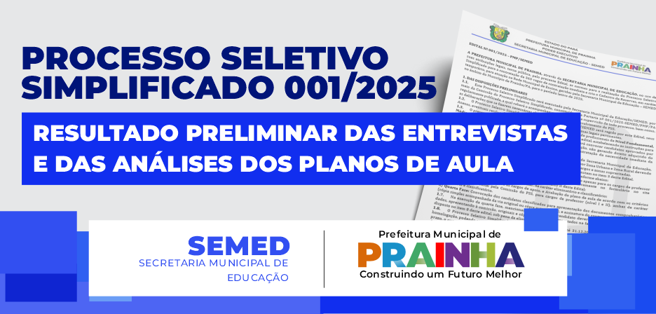 A Prefeitura Municipal de Prainha, por meio da Comissão de Organização, Acompanhamento e Fiscalização do Processo Seletivo Simplificado (PSS) Nº 001/2025, torna público o resultado preliminar da fase de entrevistas e da análise dos planos de aula dos candidatos que participam da seleção.