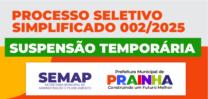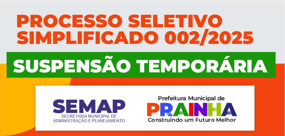 A Prefeitura Municipal de Prainha informa que o Processo Seletivo Simplificado (PSS) nº 002/2025 encontra-se temporariamente suspenso, em cumprimento a decisão judicial proferida pela Comarca de Prainha/PA.