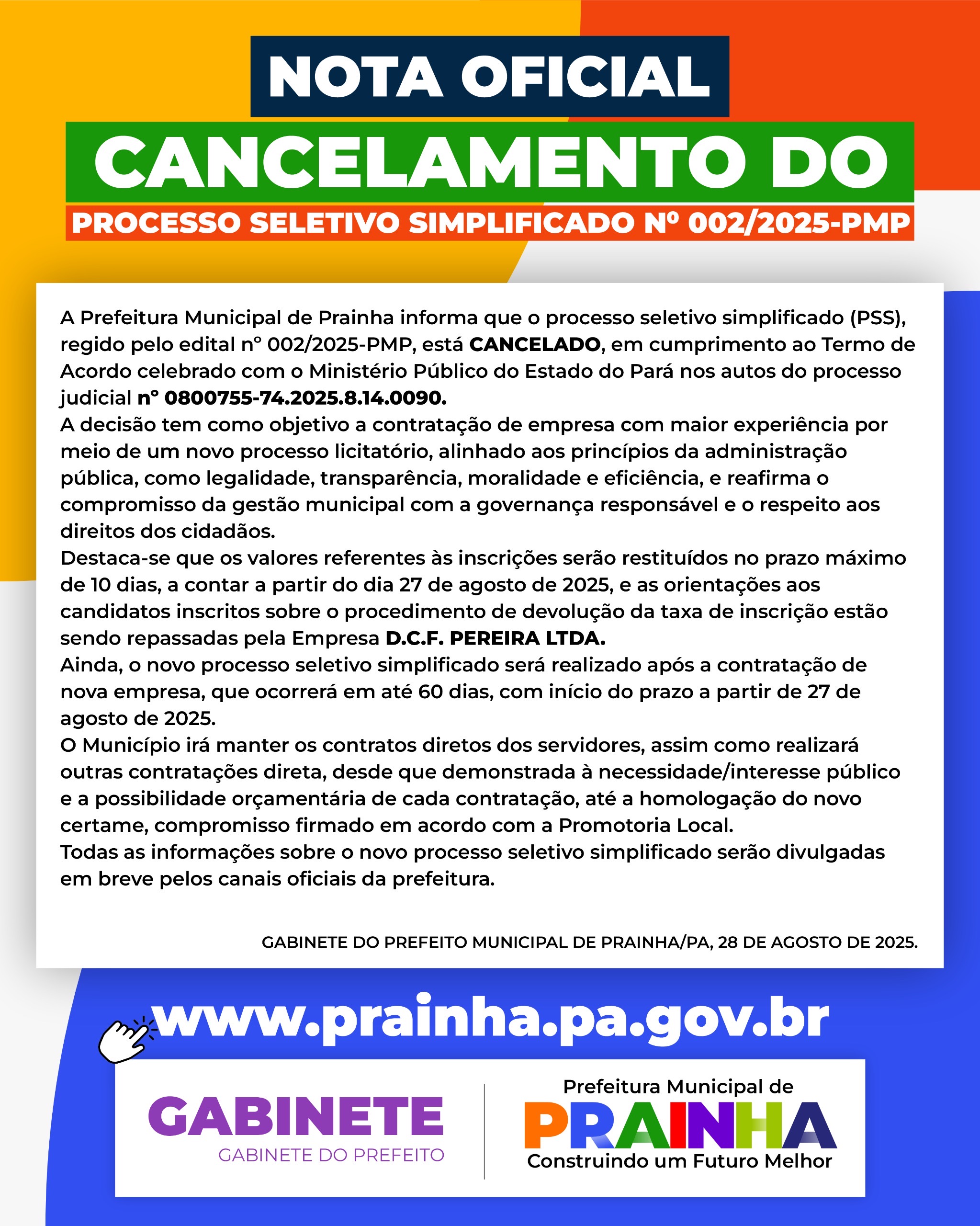 A Prefeitura Municipal de Prainha informa o cancelamento do Processo Seletivo Simplificado nº 002/2025-PMP, em cumprimento ao Termo de Acordo celebrado com o Ministério Público do Estado do Pará (processo judicial nº 0800755-74.2025.8.14.0090).