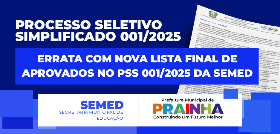 A Prefeitura Municipal de Prainha, por meio da Secretaria Municipal de Educação (SEMED), publicou nesta terça-feira, 22 de julho de 2025, uma errata referente ao resultado final do Processo Seletivo Simplificado nº 001/2025.